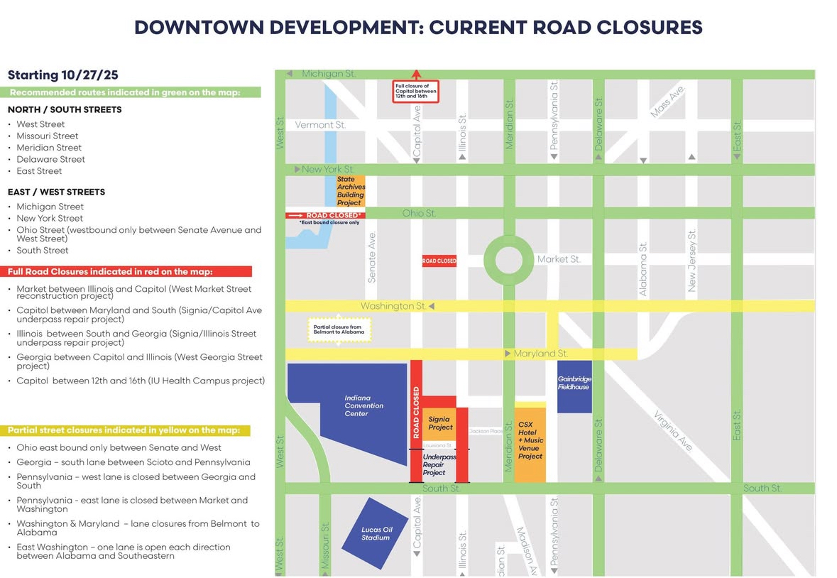 Please note the following construction taking place in downtown Indianapolis that fans will not be able to access the street closures highlighted in RED. Please plan accordingly to avoid any issues in getting to Lucas Oil Stadium.